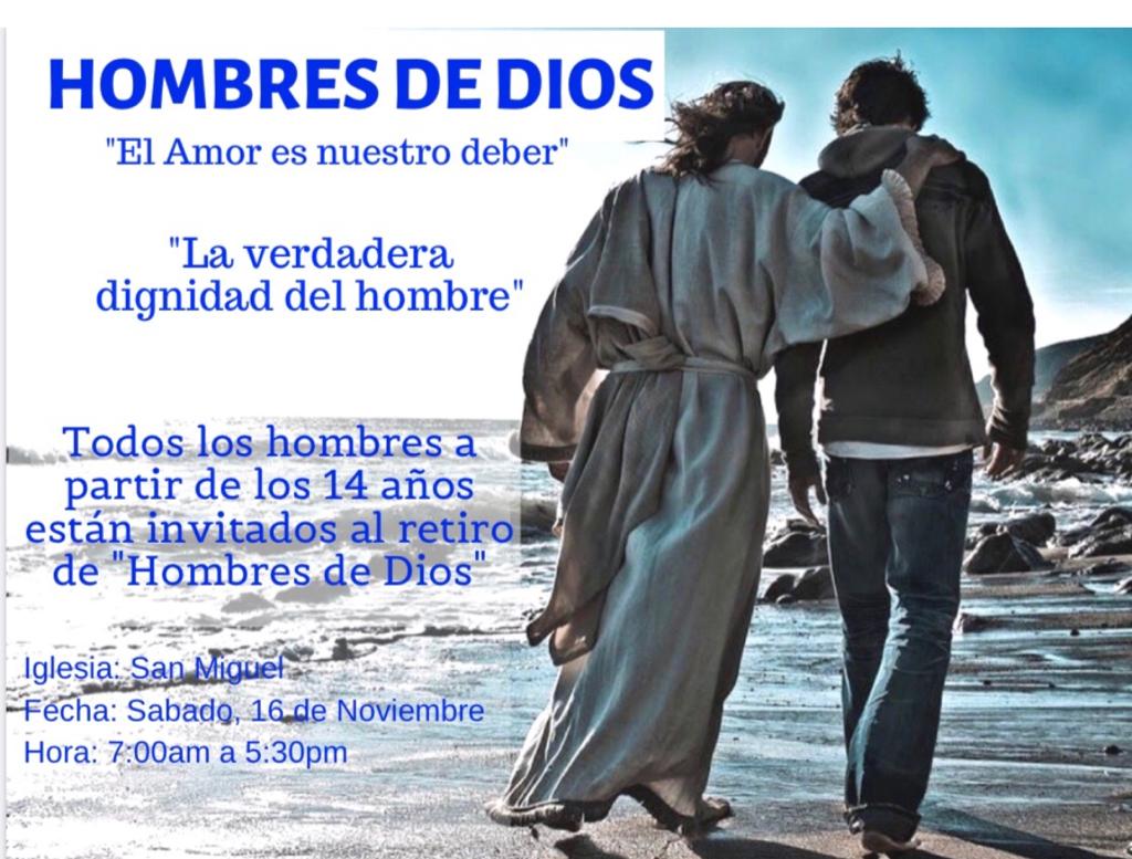 Todos los hombres a partir de los 14 anos estan invitados al retiro de “Hombres de Dios” Iglesia: San Miguel, 16 de Noviembre, 7:00 am a 5:30 pm