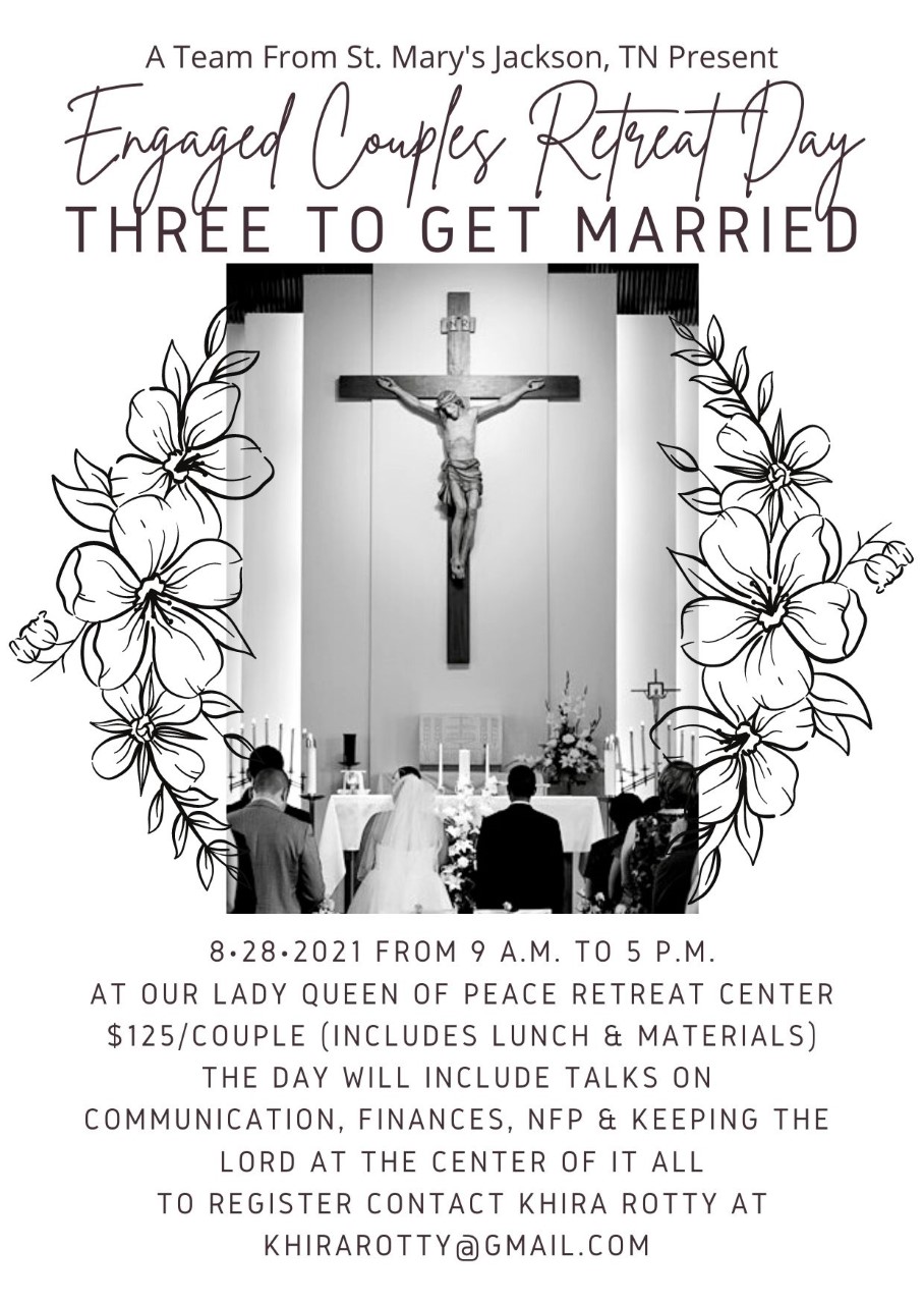 Engaged Day/Marriage Prep Retreat at OLQP, Aug. 28, Hosted by St. Mary-Jackson Our St. Mary Church in Jackson is providing an Engaged Day/Marriage Prep Retreat and all engaged couples across our Memphis Diocese are welcome to participate. Please see the following information and attached flyer from the Three to Get Married Formation Team at St. …
