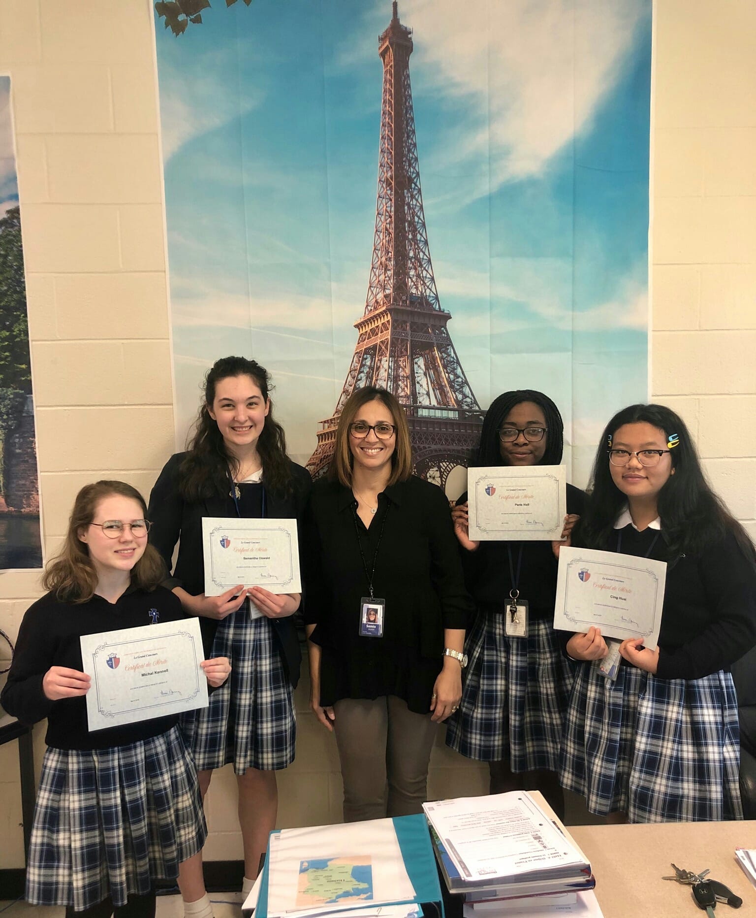 A group of Immaculate Conception Cathedral School high school students recently participated in the National French Exam, with all receiving Certificates of Merit. L-R: Michal Kennell ’19, Samantha Oswald, ’20, French teacher Samia Attallah, Paris Hall ’21, Cing (Cindy) Huai ’21.