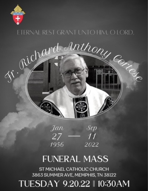 Funeral Arrangements… Fr. Richard Cortese’s funeral will take place on Tuesday, September 20, at St. Michael the Archangel Catholic Church, 3863 Summer Ave., Memphis. Visitation will occur from 9:15am-10:00am, the Holy Rosary at 10:00am and the Funeral Mass at 10:30am with Bishop David P. Talley as Celebrant and Msgr. Victor Ciaramitaro as Homilist. The Burial …