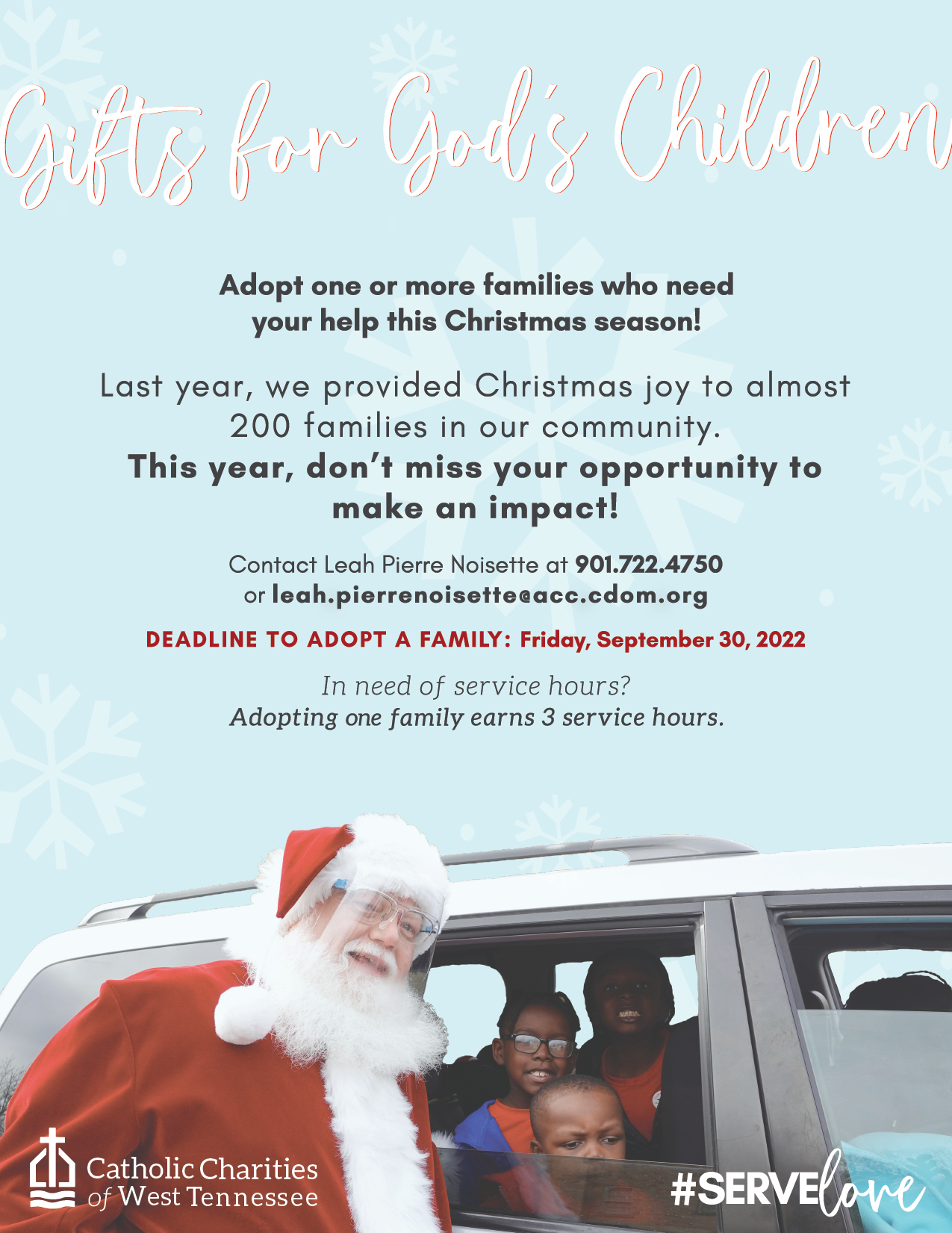 Christmas is the perfect time to focus more intentionally on our brothers and sisters in need. Gifts for God’s Children allows wonderful people and groups to adopt one, two, or more families and share the JOY of the season! Let our neighbors in need know someone cares for them. Let children know someone loves them. Let seniors know they have not been forgotten. …