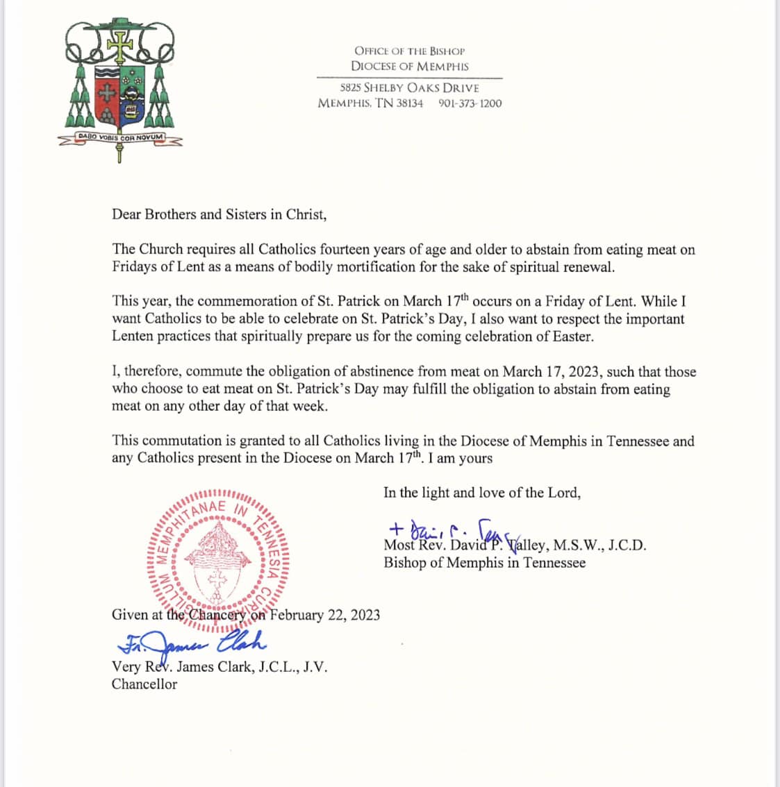 Bishop David P. Talley has commuted the obligation to abstain from meat on St. Patrick’s Day, Friday, March 17. If you chose to eat meat on St. Patrick’s Day, the obligation must be fulfilled another day that week. To read the decree, click here.