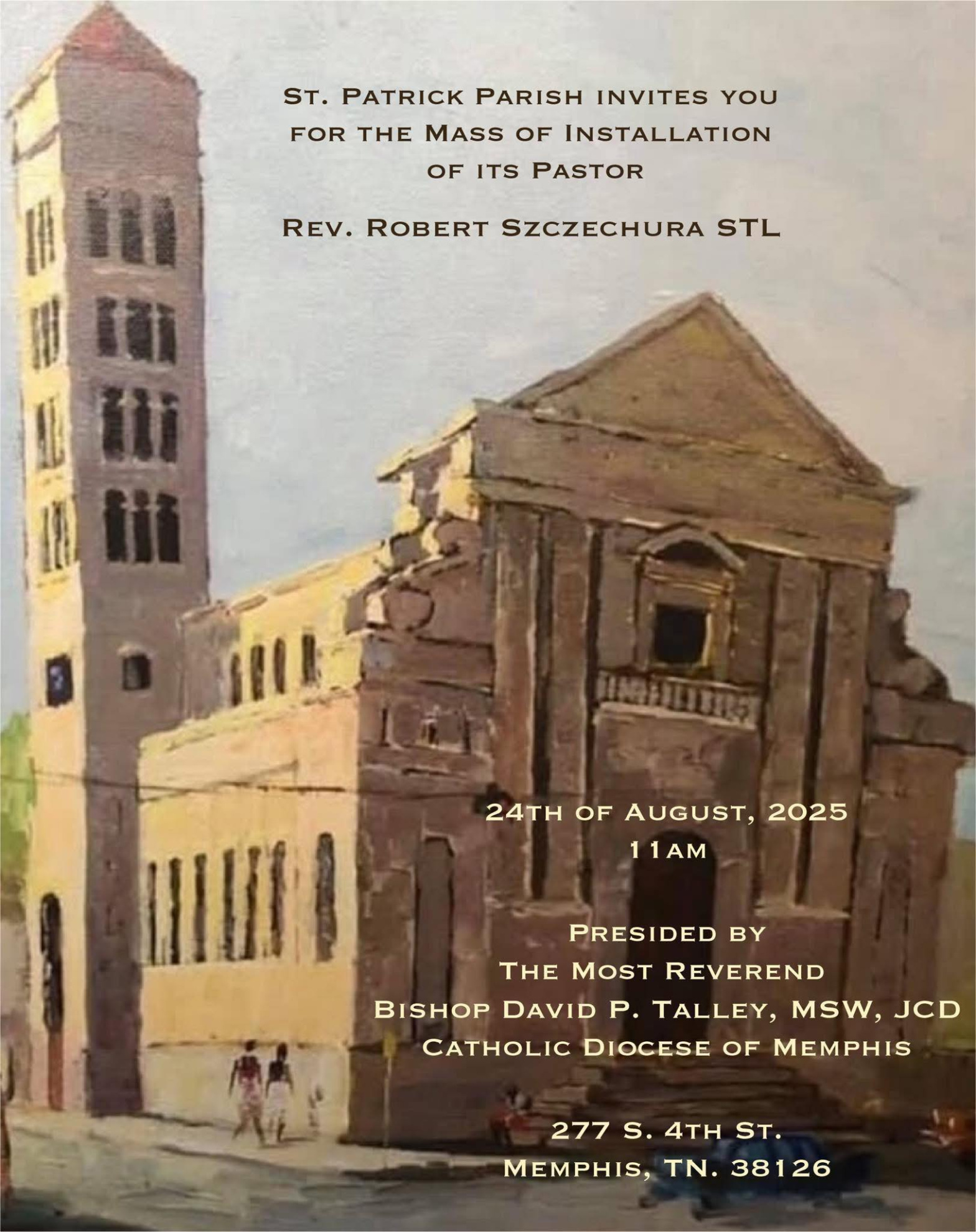 All are invited to a Holy Mass of Installation, this coming Twenty-first Sunday in Ordinary Time, August 24, 11:00am, at our beautiful and historic St. Patrick Catholic Church, 277 S 4th St., Downtown Memphis, to celebrate Father Robert Szczechura as the new Pastor. Bishop David P. Talley will be the Celebrant. Please see the flyer …