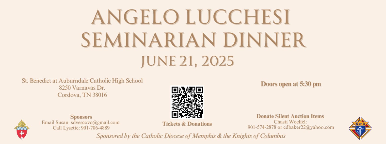 Our Diocese and Knights of Columbus Councils in West Tennessee are honored to present the Annual Angelo Lucchesi Seminarian Dinner, Saturday, June 21, at our beautiful St. Benedict at Auburndale High School. Doors open at 5:30pm. Tickets for the Seminarian Dinner fundraiser are selling quickly so get your tickets today. For information to attend, donate, …