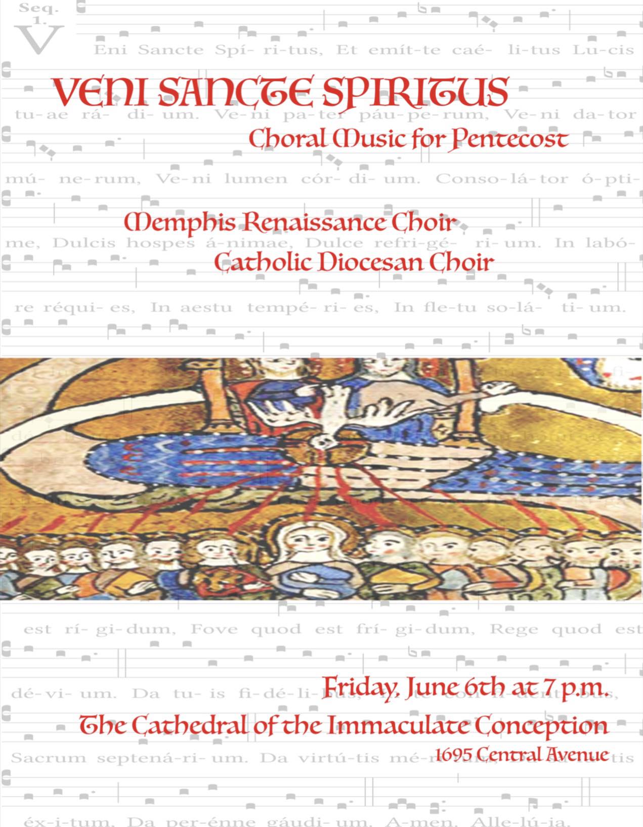 All are invited! The Renaissance Choir and our Diocesan Choir are hosting a very special Concert for Pentecost, on Friday evening, June 6, 7:00pm, at our magnificent and historic Mother Church, The Cathedral of the Immaculate Conception, 1695 Central Ave. See you there.