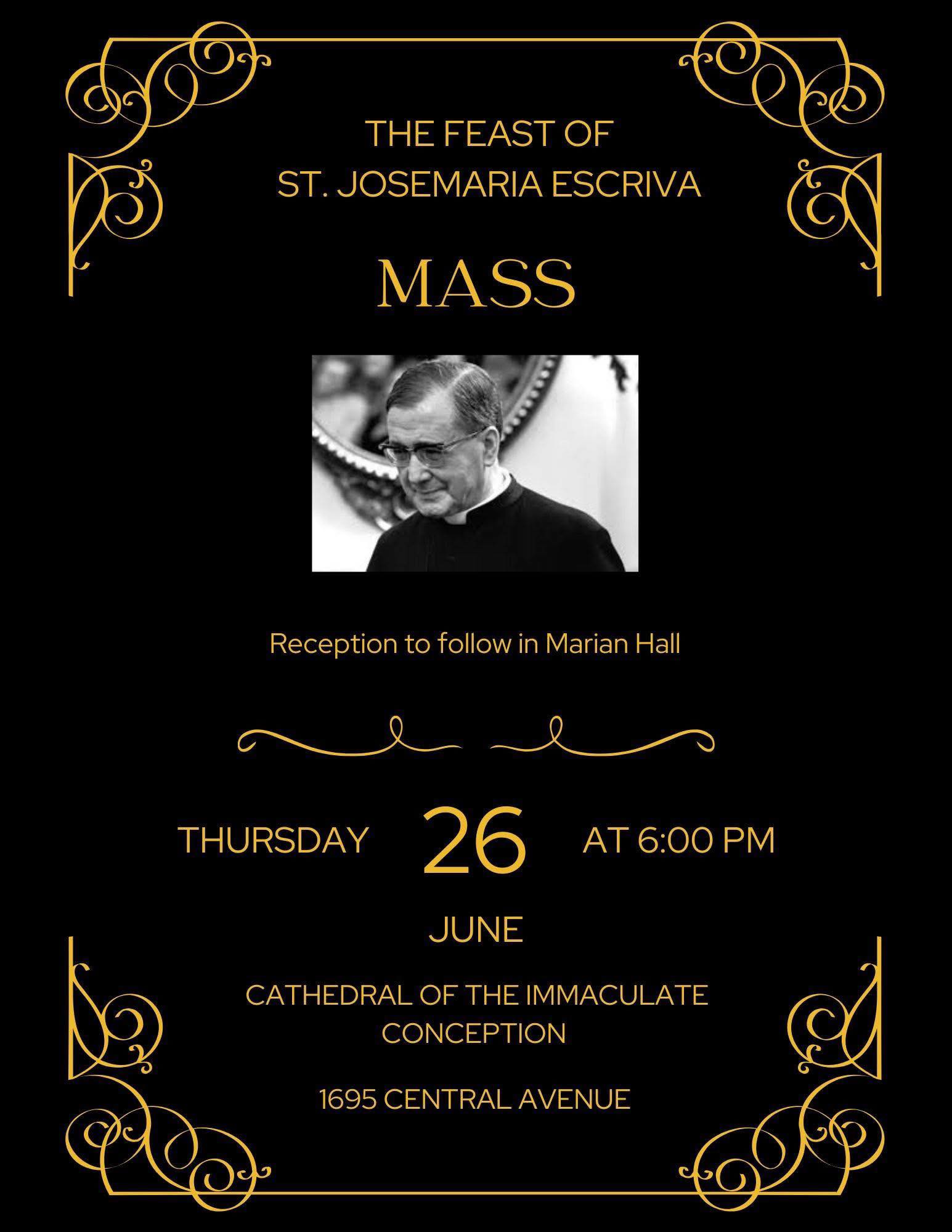 All are invited to celebrate Holy Mass in honor of Saint Josémaría Escrivá, founder of Opus Dei, this Thursday evening, June 26, 6:00pm, at our magnificent and historic Mother Church, The Cathedral of the Immaculate Conception, 1695 Central Ave. Father Carlos Donato, Pastor, St. Alphonsus, Covington, and St. John, Brownsville, will be the Celebrant.St. Josémaría …