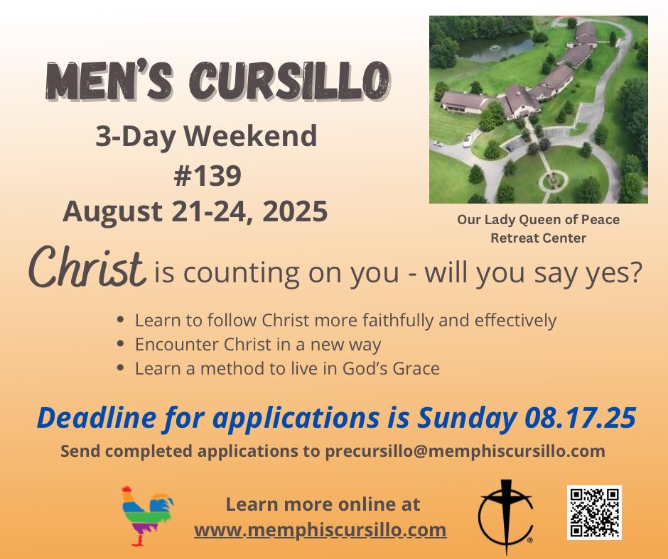 Cursillo of Memphis is now accepting applications for its next Men’s Cursillo weekend that takes place from August 21-24, at our beautiful, 140-acre Our Lady Queen of Peace Retreat Center, 3630 Dancyville Rd., Stanton. Cursillo is a movement of the Catholic Church that promotes Catholic ideals, fellowship, and spiritual growth in daily living. It provides …