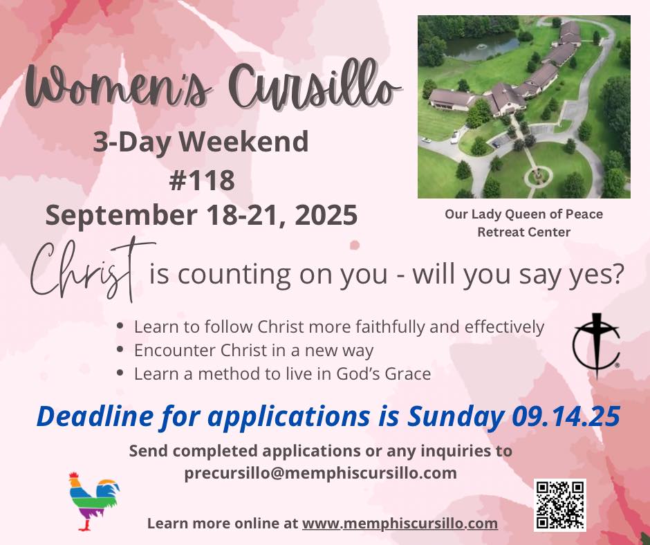 Cursillo of Memphis is now accepting applications for its next Women’s Cursillo weekend, September 18-21, at our beautiful, 140-acre Our Lady Queen of Peace Retreat Center, 3630 Dancyville Rd., Stanton.Cursillo is a movement of the Catholic Church that promotes Catholic ideals, fellowship, and spiritual growth in daily living. It provides an opportunity to deepen one’s …