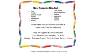 Did you know the child poverty rate in Memphis is 39%? That is the second highest rate in the country for a city our size! Catholic Charities of West Tennessee (CCWTN) is inviting you to help these children start the school year off equipped to succeed by donating to our school supply drive. Order online from our Amazon Wishlist at tinyurl.com/CCWTNschoolsupply and your donation will ship right to us! Donations can also be dropped off at CCWTN (1325 Jefferson Ave.) now through Aug. 1. Keep an eye out for a Volunteer Saturday event to pack the school supplies, which are given to the children of CCWTN clients! For more information contact Rachel D’Addabbo at rachel.daddabbo@acc.cdom.org or 901-722-4750.