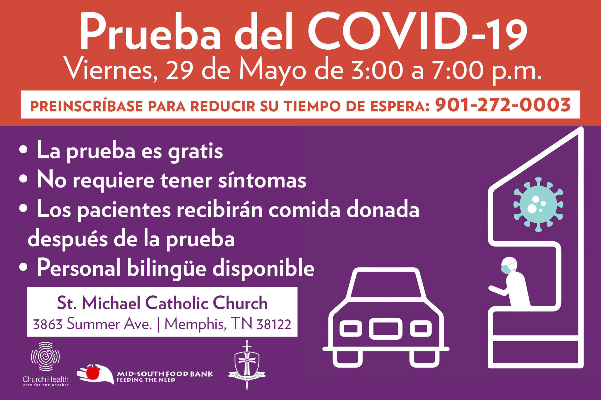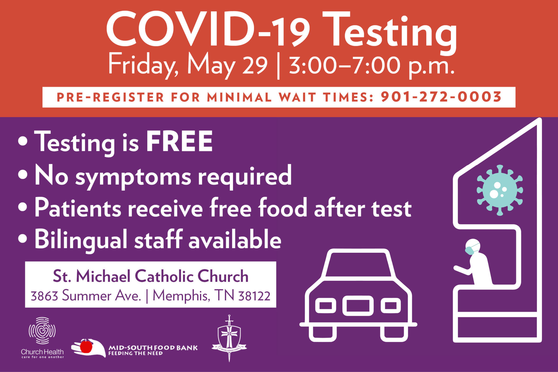 Memphis, Tenn. – On Friday, May 29, from 3-7pm, St. Michael’s Catholic Church is partnering with Church Health to offer free drive-thru COVID-19 testing. The event is open to everyone, whether or not a person has symptoms. There is no appointment needed, but it’s highly encouraged to pre-register to reduce wait times by calling: (901) 272-0003. Please bring an ID and contact information to check-in and receive follow-up instructions. All individuals tested will receive food from Mid-South Food Bank. The testing will have bilingual staff to make sure language is not a barrier to testing and health care. Also, please see the attached posters in English and Spanish on the testing.