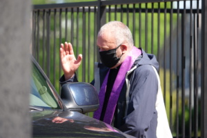 He sat outside of the chapel at St. Ann’s Catholic Church in Bartlett, Tenn., wearing a long black cassock, gray jacket, and black mask. As cars pulled up, he quietly and privately heard their confessions, occasionally bowing, his eyes peering from behind his mask into the car window.