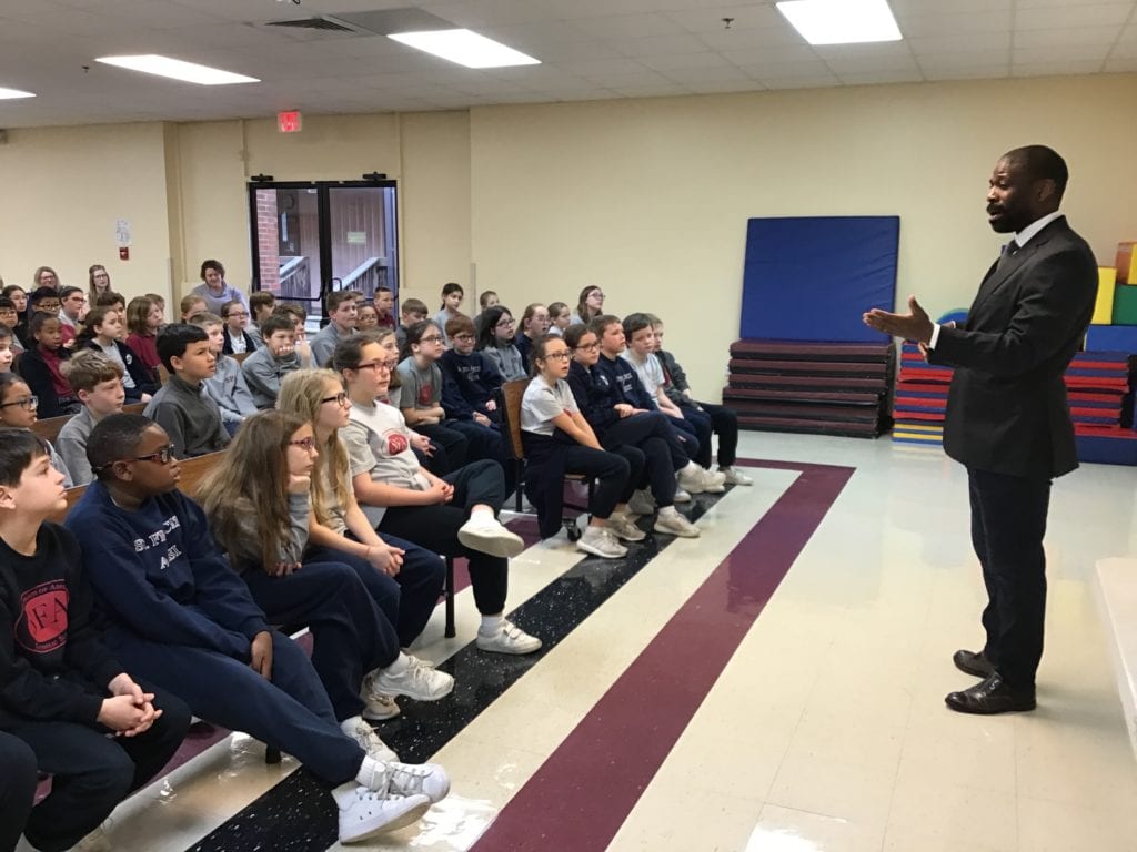 Cordova, Tennessee – February 13, 2019 – Mr. Ekundayo Bandele, Founder and Executive Producer of Hattiloo Theatre talked to 3rd -5th grade students at St. Francis of Assisi School on Tuesday about his life, love of theater and the arts, and the challenges and rewards of running one of only four free-standing black theaters in the country.