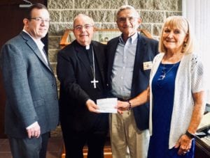 Frank P. Lamanna Sr. Scholarship Chairman and Mike Richert Grand Knight of Germantown Council 7449 present checks totaling $11,394 to Bishop David Talley and Janet Donato Superintendant of Memphis Catholic Schools. These checks were presented in honor of Jim Arnold a deceased Brother Knight of the Council who was instrumental in the raising of these funds over the years.