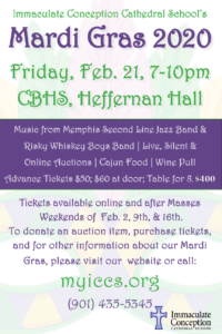 Immaculate Conception Cathedral School’s Mardi Gras event will take place from 7-10pm, Friday, Feb. 21 at CBHS-Heffernan Hall. The evening will feature music from the Memphis Second Line Jazz Band and the Risky Whiskey Boys, live auction with Joe Birch, silent and online auctions, and a Cajun buffet. Tickets are $50 in advance and include the buffet dinner. Cash bar with wine and beer. Tables of 8 are $400. Sponsorships are available. Call 435-5345 for information or visit myiccs.org.