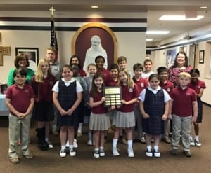 May 17, 2019 – For the first time this year, Catholic Charities of West Tennessee invited Catholic schools in our area to engage in a little friendly fundraising competition by hosting a Jeans Day benefitting Catholic Charities and the work they do to help the needy members in our community. The school that raised the most money per student would have the honor of displaying the traveling Jeans Day plaque at their school for the year. The six schools that participated raised over $3,800 for Catholic Charities where they serve those in need through the Housing Ministery, Food Pantry, mobile food distribution, Clothing Closet, Reading Room, and the Immigration program. Of the six participating schools, SFA raised the most per student and was awarded the Jeans Day plaque by Mrs. Brenda O’Looney from Catholic Charities of West TN.