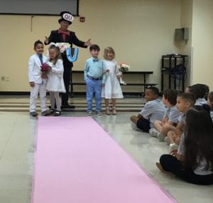 May 2, 2019- Kindergarten students, parents, and teachers at St. Francis of Assisi Catholic School celebrated the marriage uniting the unique letter “Q” to the very special letter “U” at a quarter past 9 in the morning.  Since Q and U are always together, they were married so that they can be united forever.  This wedding was the culmination of several lessons about both letters, the sounds they make individually, and the combined sound they make.  These two letters need each other to make the combined sound of QU (Kwa) in words like quarterback, queen, quilt, quick, and quiz.  In addition, the kindergarten students made a quilt showcasing all the QU words they learned.  “This exquisite ceremony provided a fun and memorable way for young readers and spellers to remember the spelling rule of the letters Q and U,” said Mrs. Debbie Cassman, Kindergarten teacher.