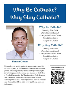 Mark your calendar now for Damon Owens, international speaker and evangelist, on “Why Be Catholic?” this coming Monday afternoon and evening, March 24, and “Why Stay Catholic?” the next day on Tuesday afternoon and evening, March 25, at our beautiful St. Louis Catholic Church, 203 S White Station Rd. Please see the flyer below for more details.